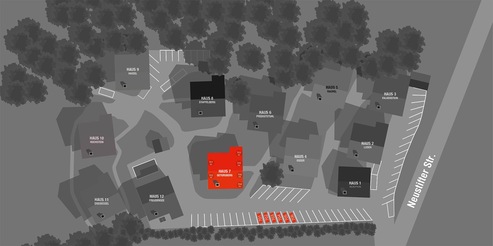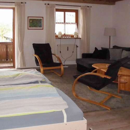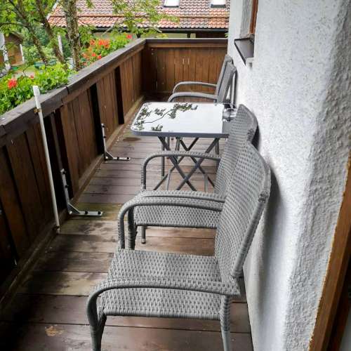 Auf dem großen Balkon können Sie die idyllische Aussicht auf die umliegende Natur genießen, während Gartenmöbel, Sonnenliegen und ein Sonnenschirm zum Entspannen einladen. Die Wohnung ist rauchfrei, allergikerfreundlich und auch für Rollstuhlfahrer geeignet. Haustiere sind nicht erlaubt.